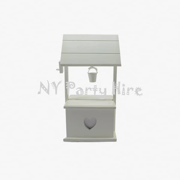 When it comes to Weddings / Engagements / or any party, a wishing well is an essential item to have. Why not have this gorgeous white cheap wishing well for hire from NY Party Hire. This cheap wishing well in Sydney can hold more than 150 envelopes. This pretty table top wishing well comes with a heart shape compartment to put in your picture to make it a more elegant wishing well.